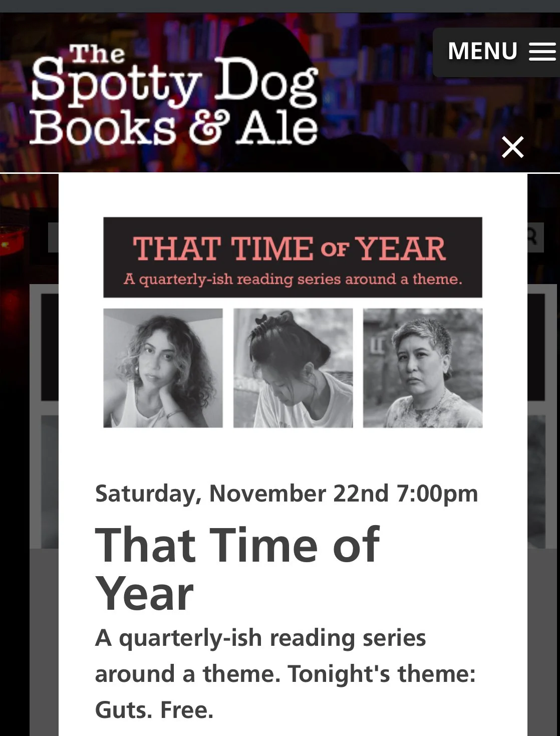 Sa 22 Nov 7pm EST: That Time of Year Reading Series w/ Ariana Reines + Christine Shan Shan Hou, hosted by Andrea Kleine | Spotty Dog Books, Hudson, NY.