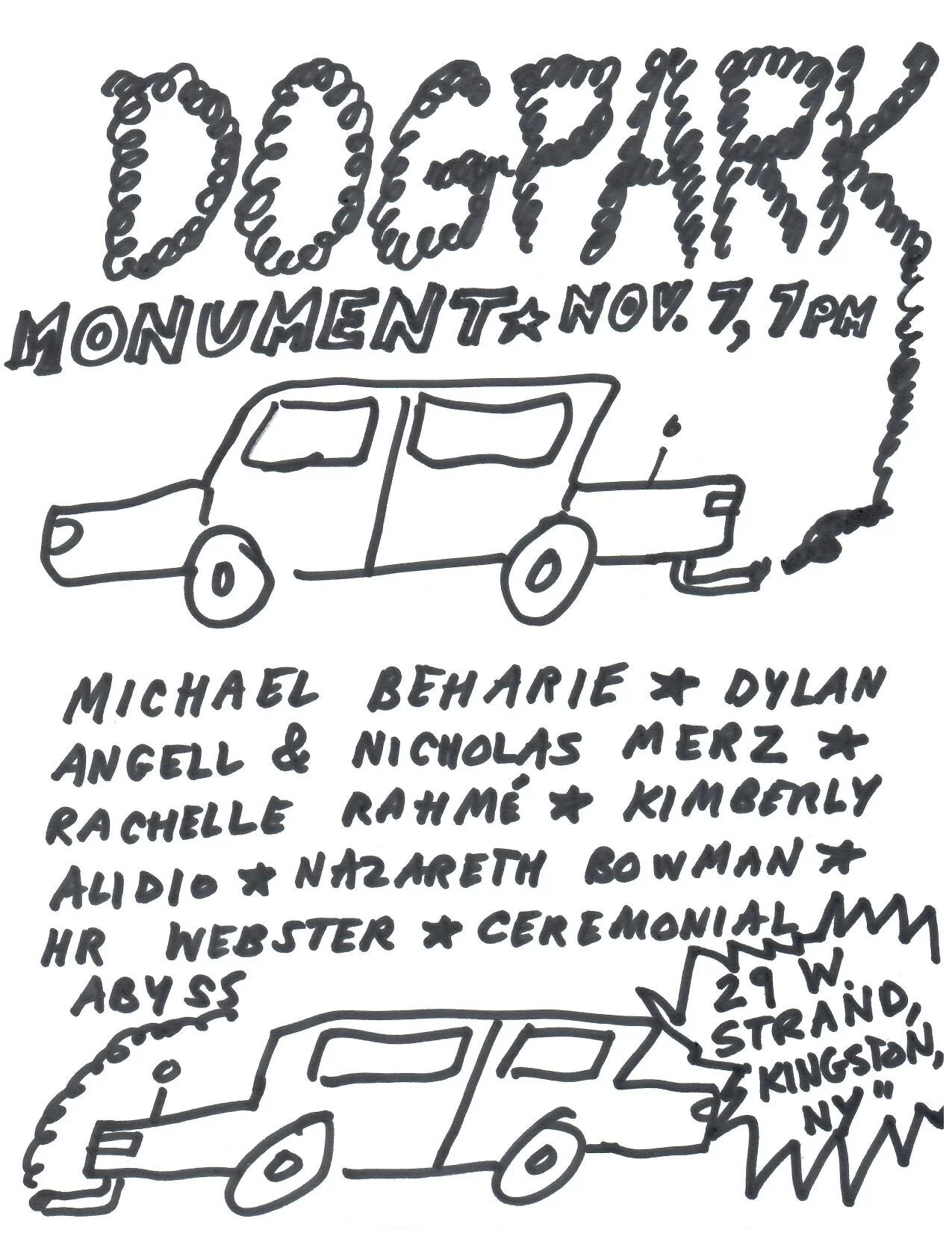 Sa 7 Nov 7pm EST: Dogpark Reading Series w/ writers, rachelle rahmé, HR Webster, Nazareth Bowman, + sound artists Dylan Angell & Nicholas Merz, Michael Beharie, Ceremonial Abyss | Monument Gallery, Kingston, NY.