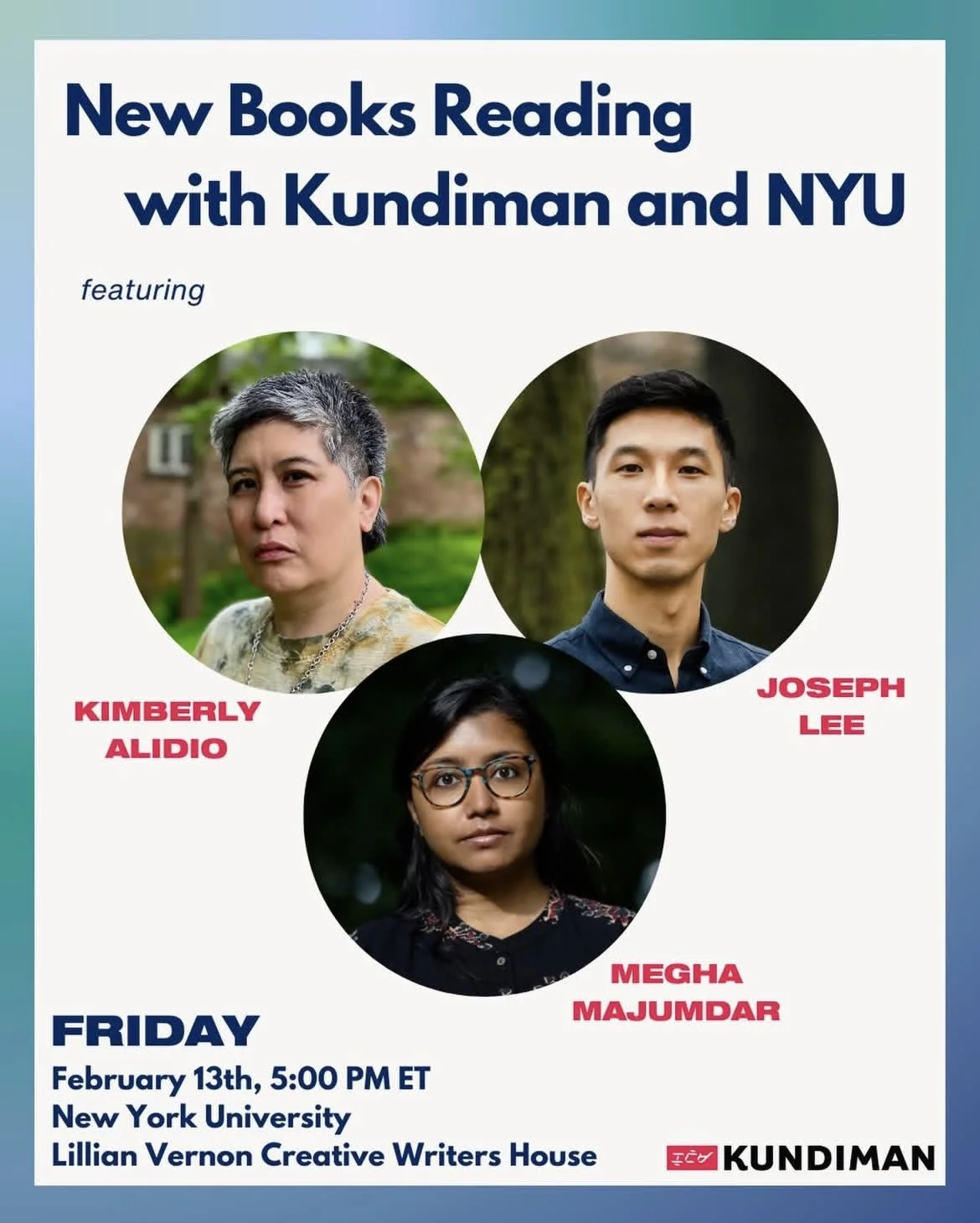 F 13 Feb 5pm Kundiman x New York University Creative Writing: New Books Reading w/ Kimberly Alidio, Joseph Lee, and Megha Majumdar | Lillian Vernor Writers House, New York, NY.