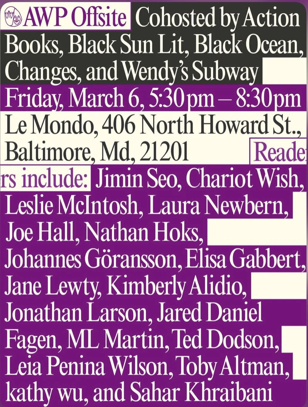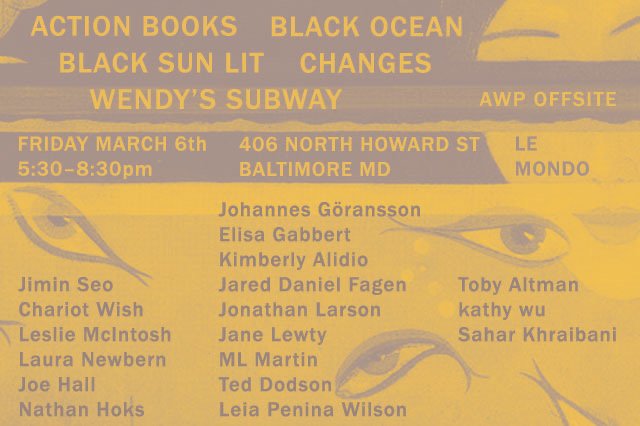 Action Books x Black Sun Lit x Black Ocean x Changes Press x Wendy’s Subway AWP Off-site Reading w/ Jimin Seo, Chariot Wish, Leslie McIntosh, Laura Newbern, Joe Hall, Nathan Hoks, Johannes Göranson, Elisa Gabbert, Jane Lewty, Jonathan Larson, Jared Daniel Fagen, ML Martin, Ted Dodson, Leia Penina Wilson, Toby Altman, kathy wu, + Sahar Khraibani| Le Mondo, Baltimore, MD.