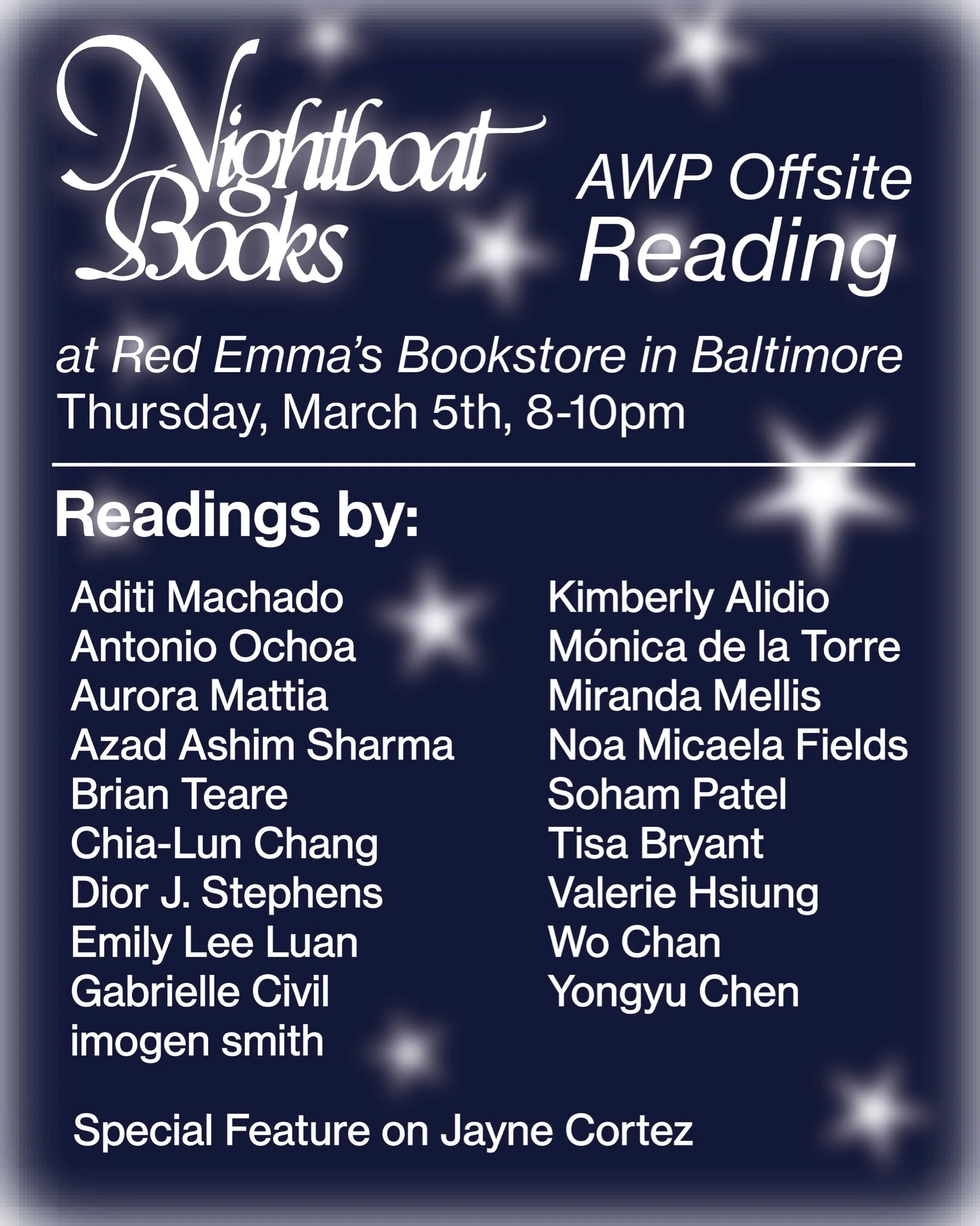 Nightboat Books AWP Off-site Reading w/ Aditi Machado, Antonio Ochoa, Aurora Mattia, Azad Sharma, Brian Teare, Dior J. Stephens, Emily Lee Luan, Gabrielle Civil, imogen smith, Miranda Mellis, Noa Fields, Soham Patel, Tisa Bryant, Valerie Hsiung, Wo Chan, Yongyu Chen | Red Emma’s Bookstore, Baltimore, MD.