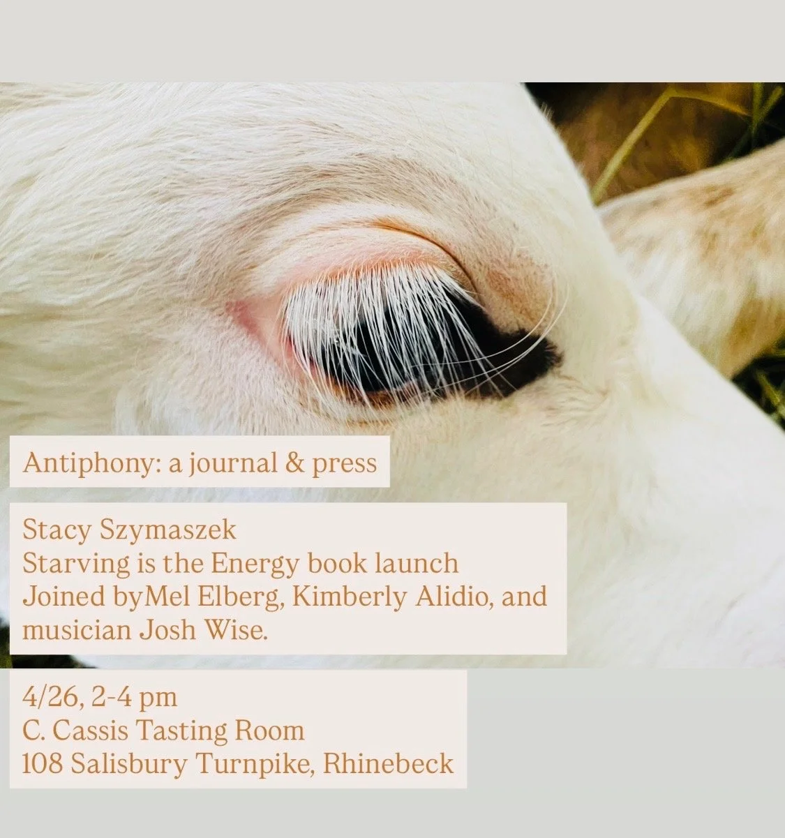 Su 26 Apr 2-4pm EDT: Book launch for Stacy Szymaszek’s Starving Is the Energy w/ Mel Elberg, Josh Wise | Antiphony | C.Cassis, Rhinebeck, NY
